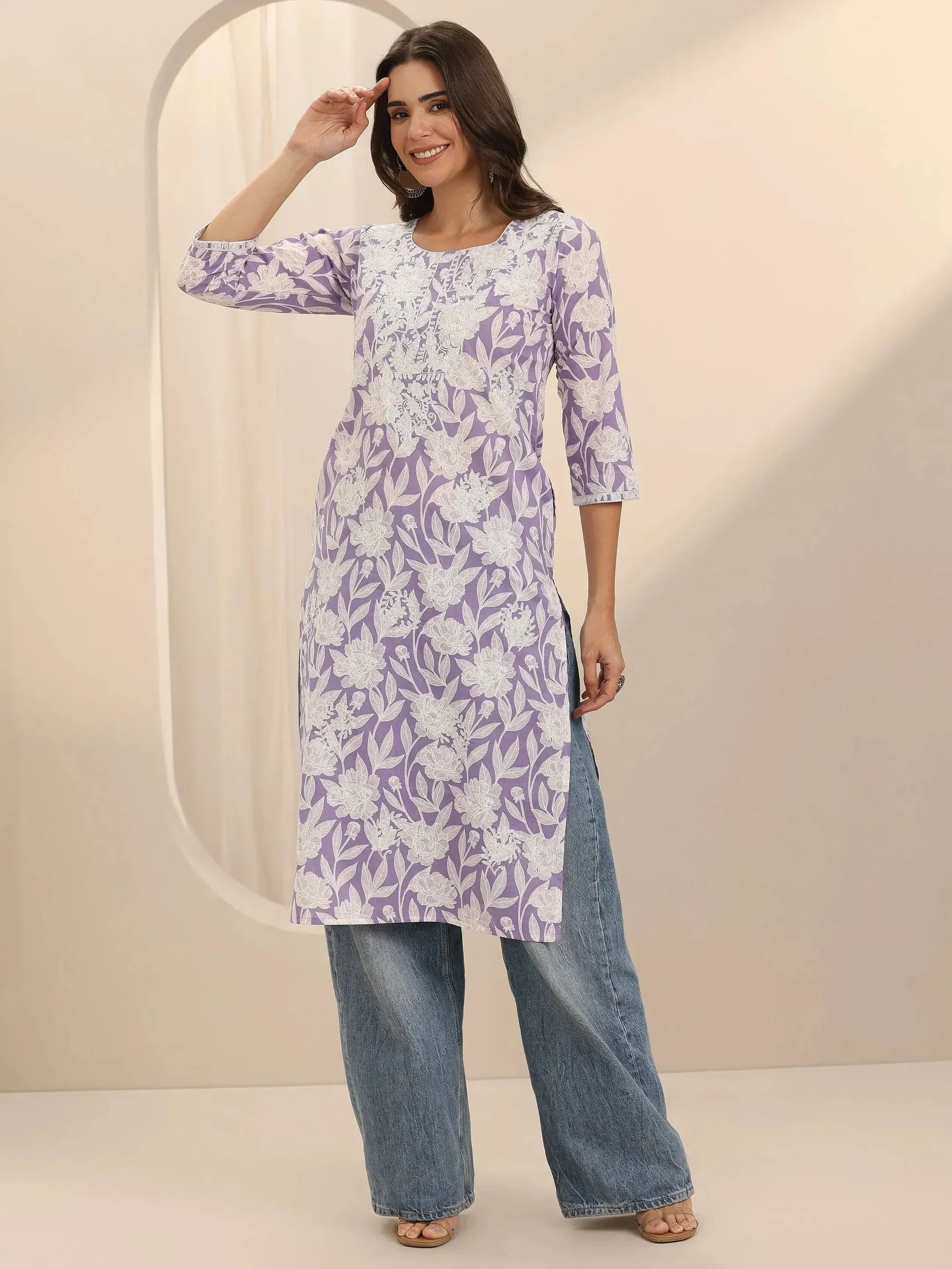 Lavender Straight Printed Cotton Kurta