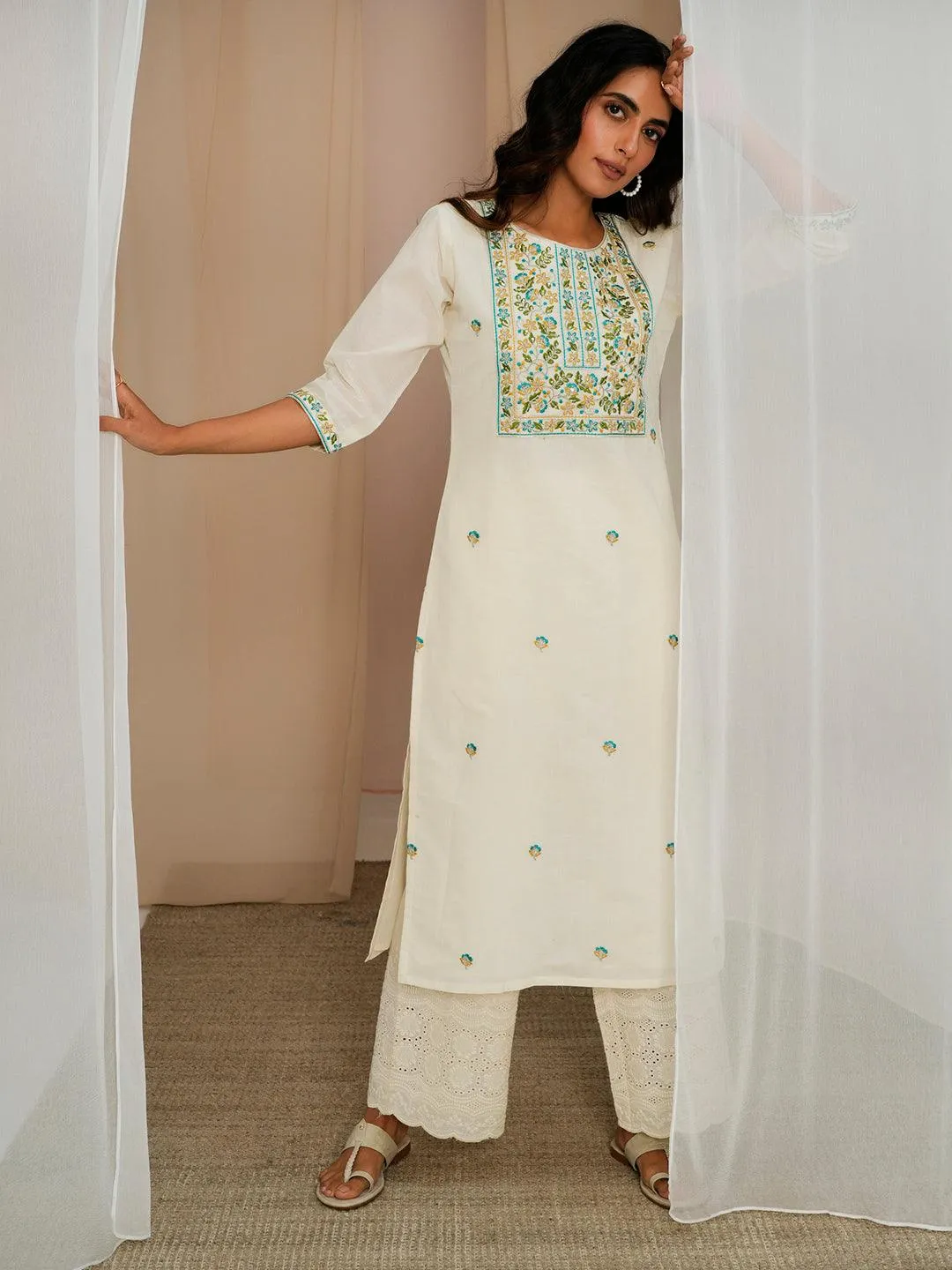 Off White Embroidered Cotton Straight Kurta