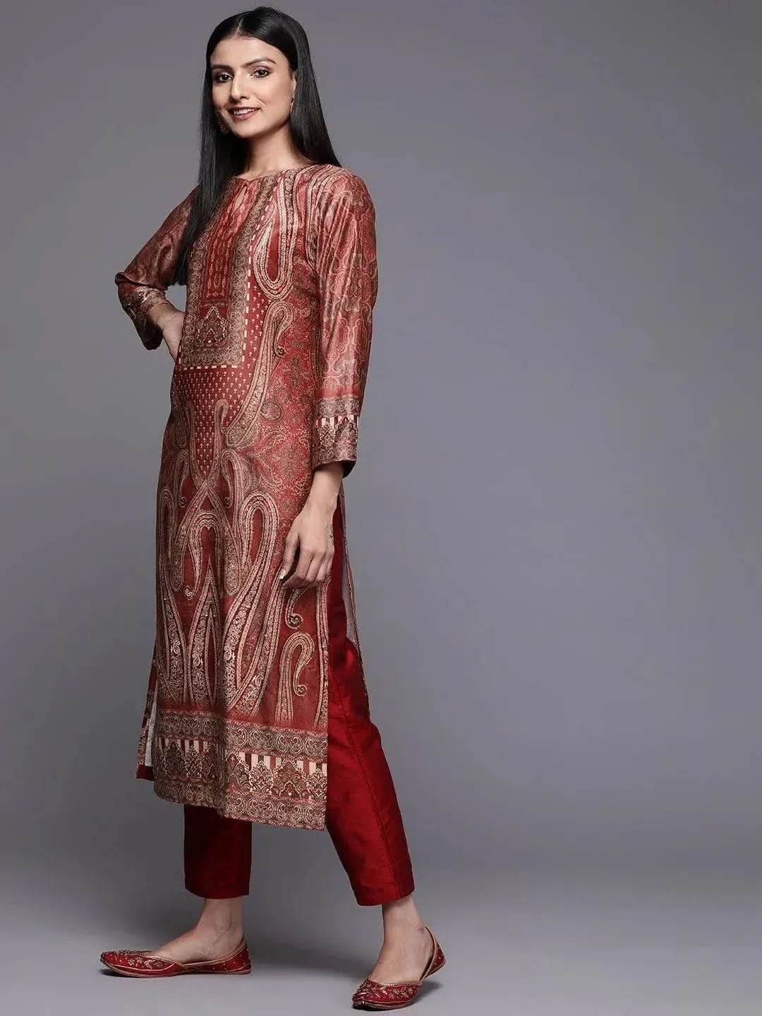 Rust Printed Velvet Straight Kurta