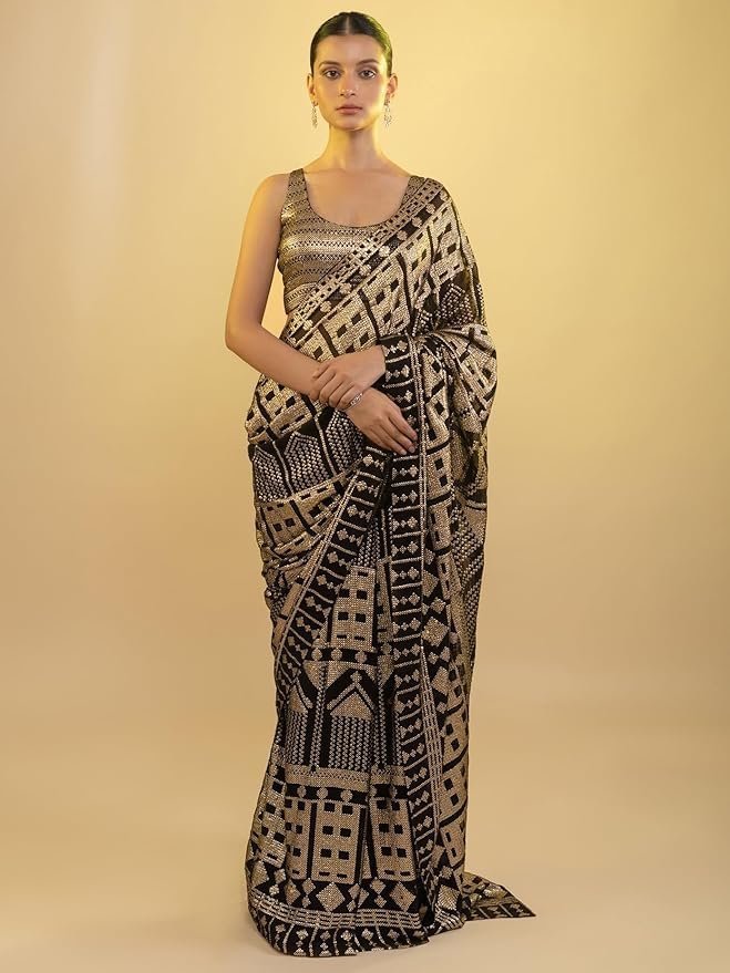 Women’s Black Sequins Work Heavy Georgette Saree with Blouse (1024-Black-Sequins-Designer-Saree-Latest, Black)